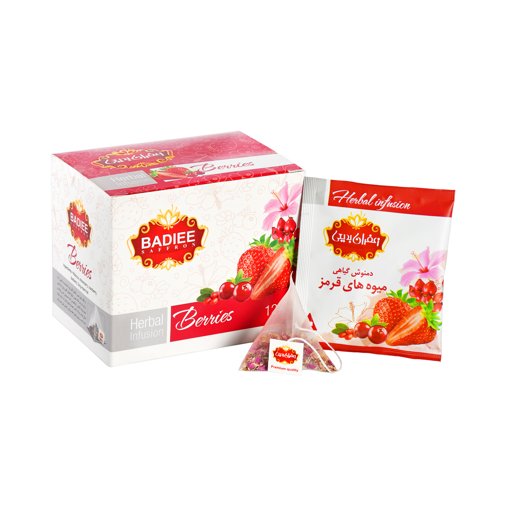 دمنوش میوههای قرمزبدیعی، از نوشیدنیهای ترشمزه و خاص بدیعی است که دید فرد را نسبت به دمنوش کاملا عوض میکند. دمنوش میوههای قرمز بدیعی بدون افزودنی و نگهدارنده شیمیایی، از ترکیب تازهترین و مرغوبترین گیاهان ساخته شده. در تی بگهای ابریشمی بدون دخالت دست و با جدیدترین تکنولوژیهای روز دنیا بستهبندی میشود. مزیت این نوع بسته بندی، حفظ طعم و رنگ بیشتر دمنوش است.